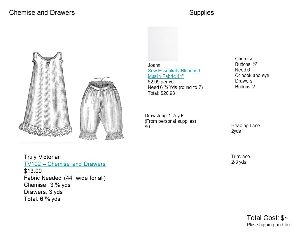 The Base Layer Undergarments consisting of Chemise, Drawers, and Corset made by me. The other items include stockings and shoes that were purchased.