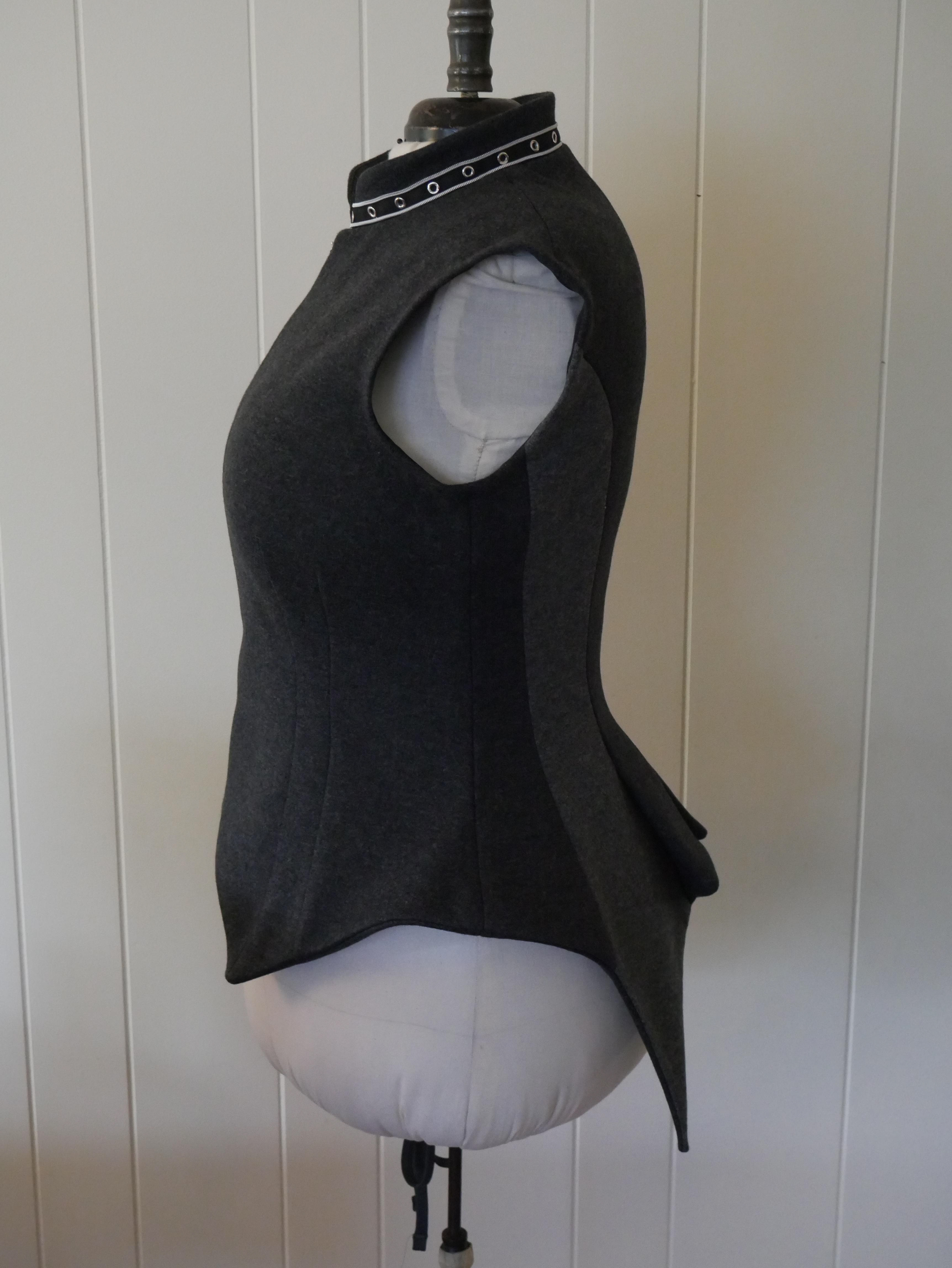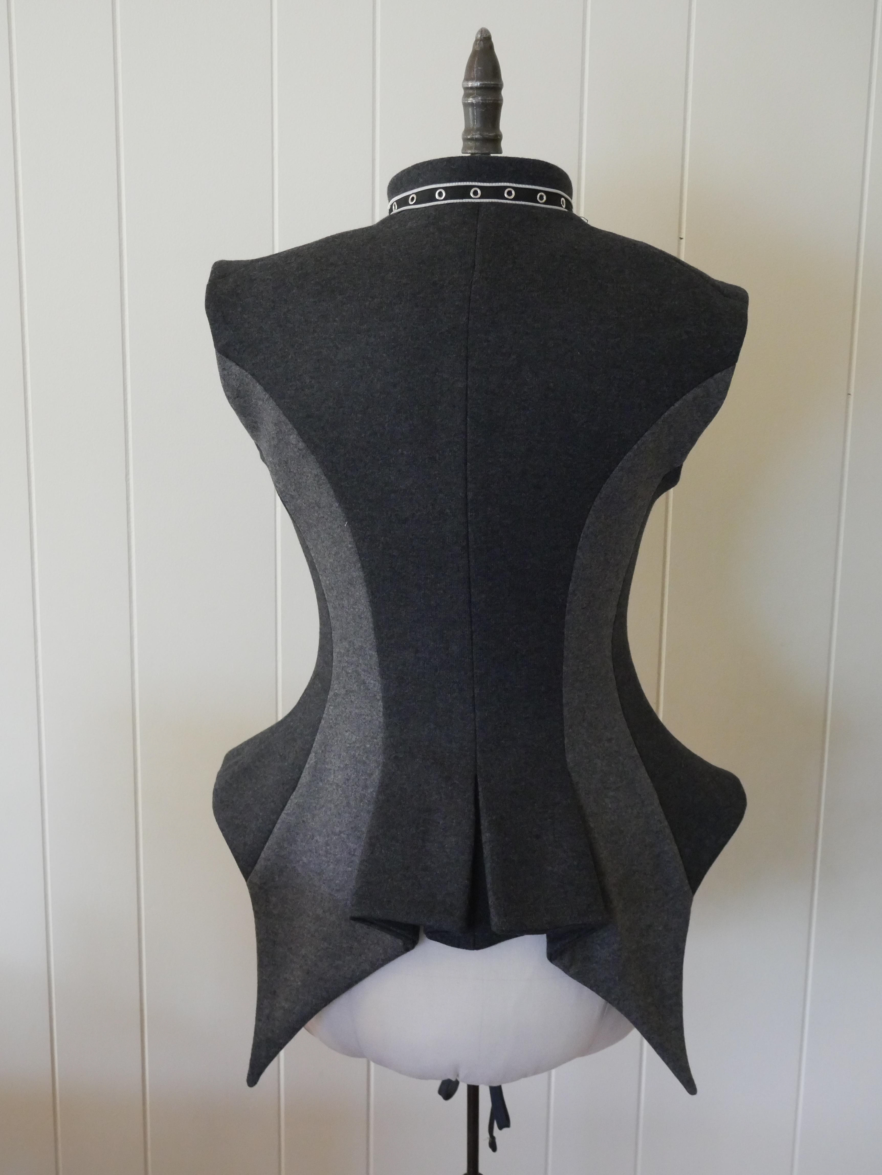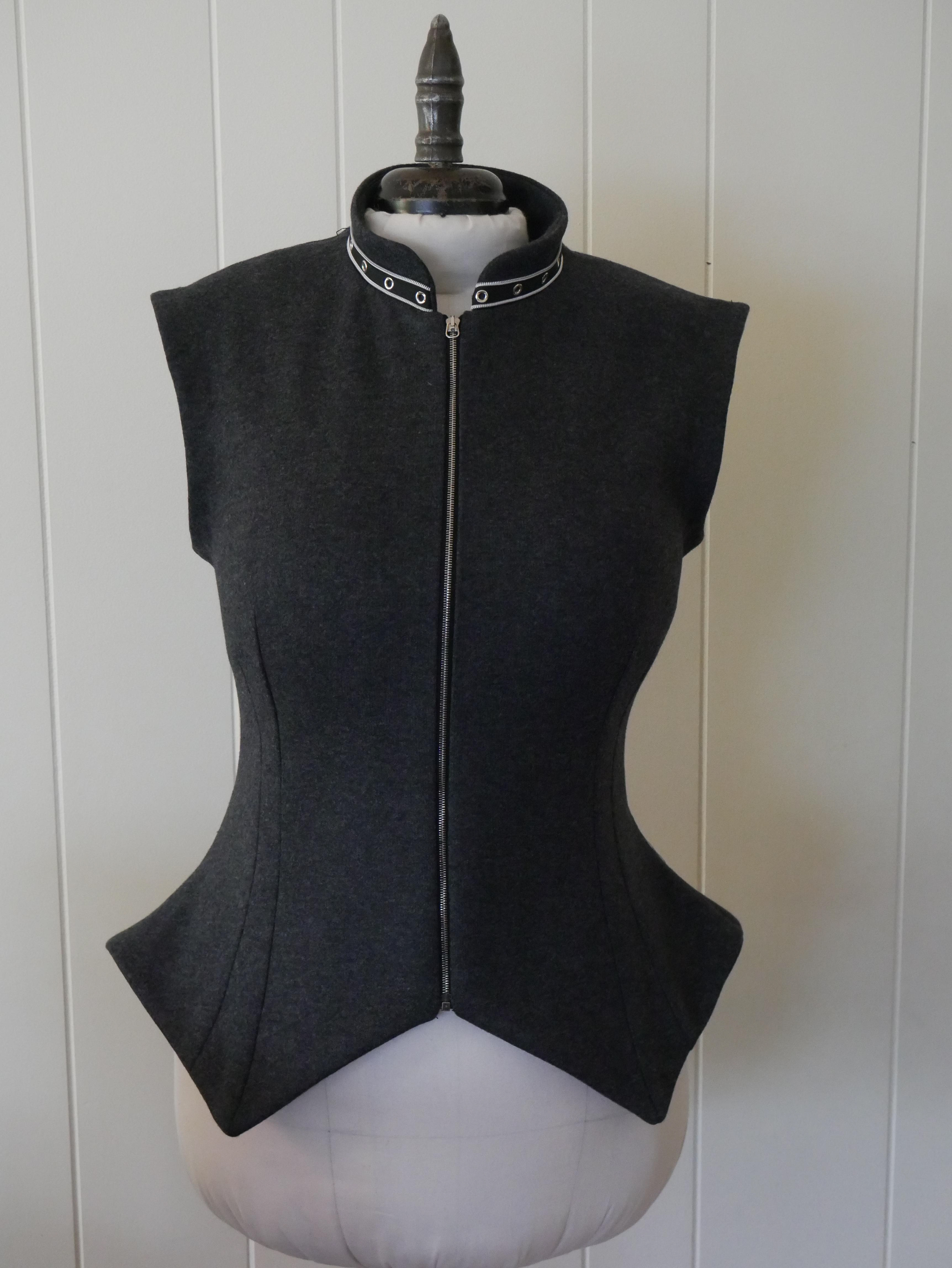 Made from a stable knit wool with purchased trim at neckline, center metal teeth zipper, and grosgrain ribbon facing in the armscye. Tails panel are highlighted by using the back of the wool as it was a lighter grey