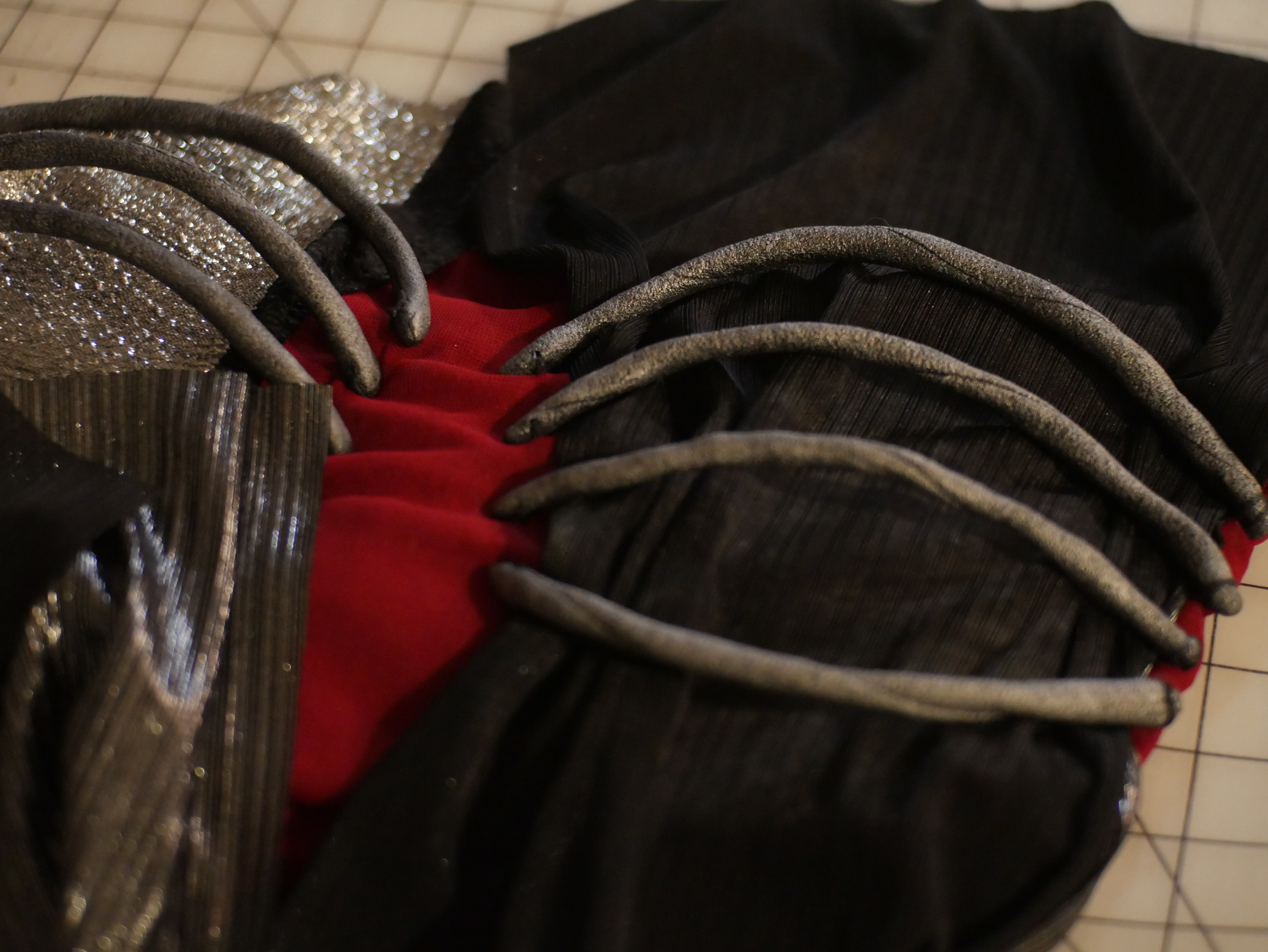 Segments made from Worbla with a tin foil base to conserve materials and remove weight
