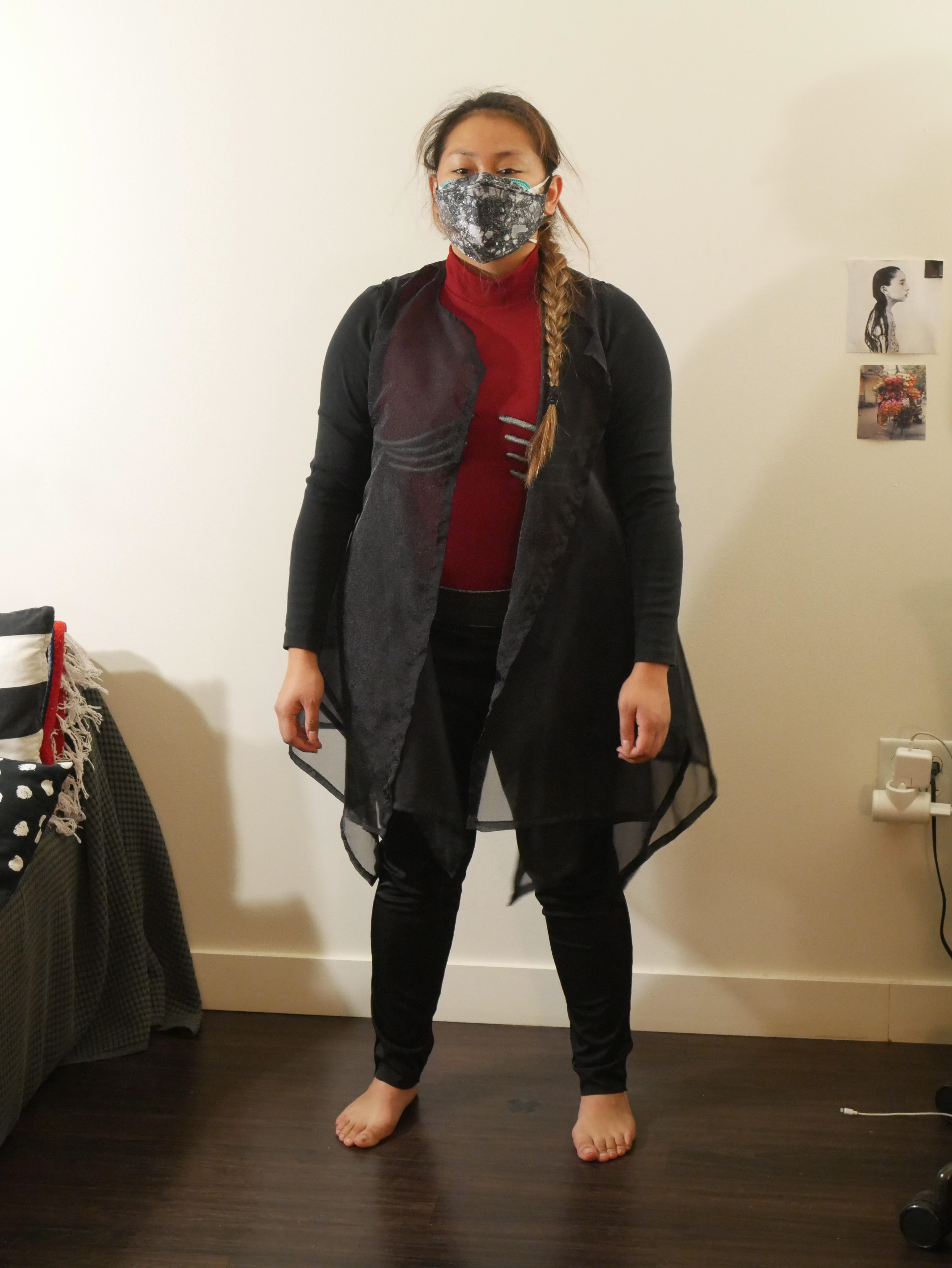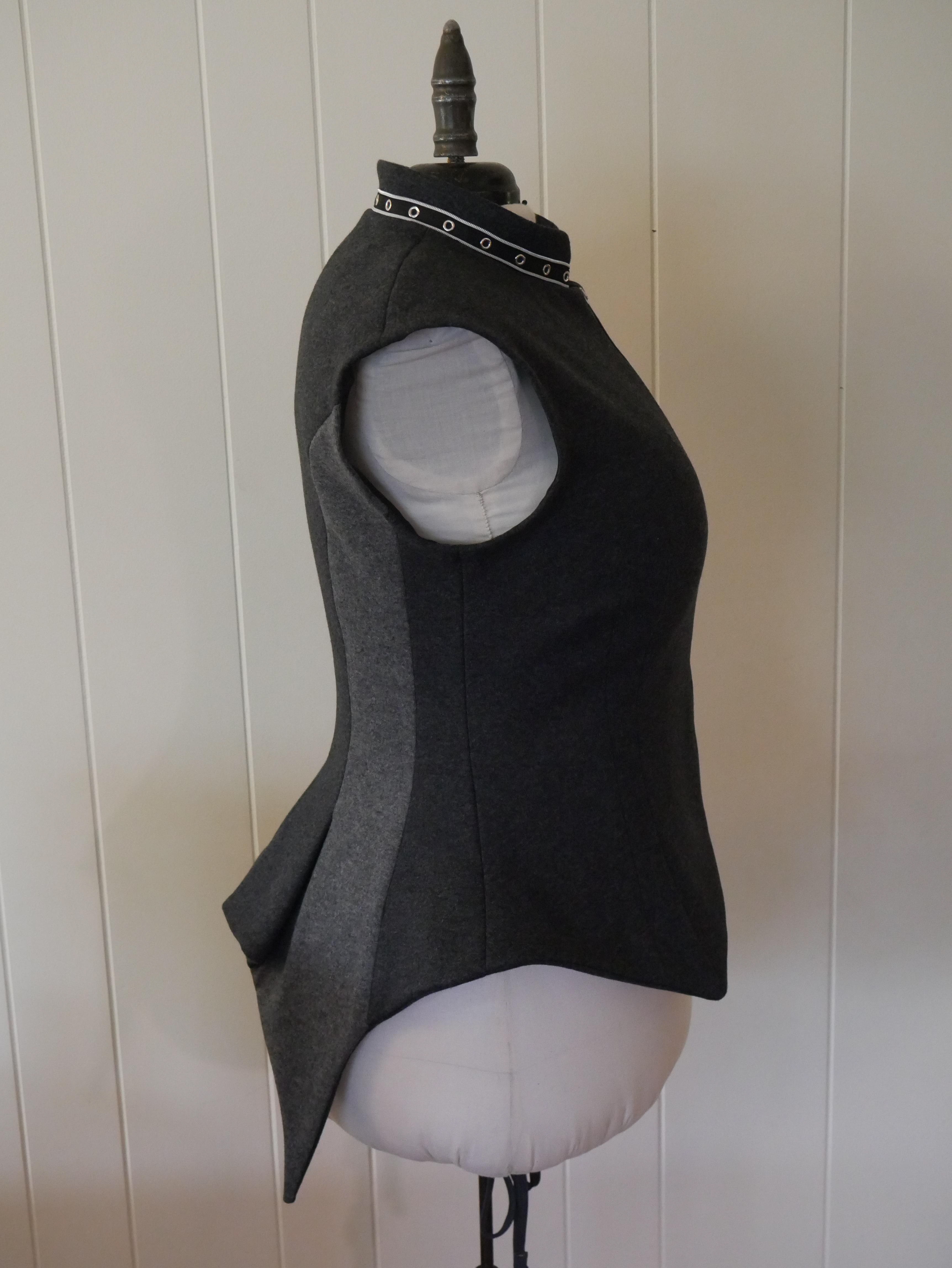 Hoodie with spine along the back. The coat is a stable knit grey wool with satin ribbon trim, the hood and collar has a wire running through a casing to make it posable. the spine was made from Worbla and then painted silver.